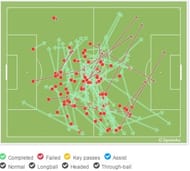The Englishman has a clear edge in forward attacking play over the German and the Frenchman. He has completed almost twice as many passes and most of them have been forward passes.