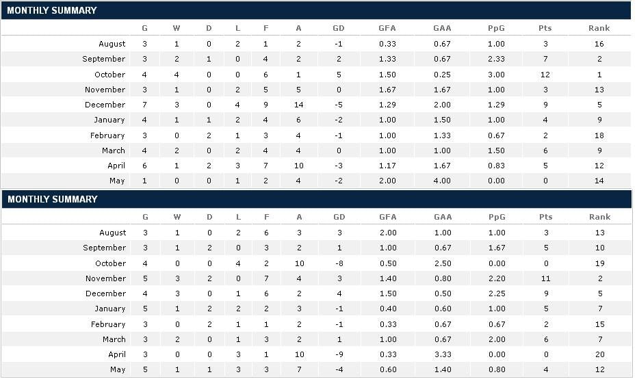The other point of interest is Wigan’s performances in the same corresponding months in the seasons 2005-06 & 2008-09. In each of these seasons, Wigan was in a better position to finish the league engagements in mid-table. Accordingly, their performances in final four months were left a lot to be desired.