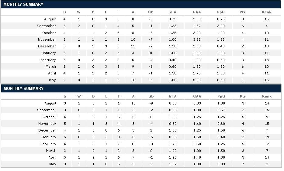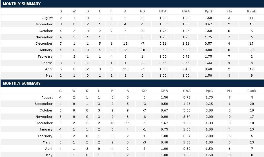 The above tables show the month wise break up of Wigan’s performance in the years, when they carried out their escape heroics- 2006-07(17th); 2007-08(14th); 2009-10(16th); 2010-11(16th).In each of these years, the results drastically improved in the closing months-Feb, March, April and May- during thick of survival battle.