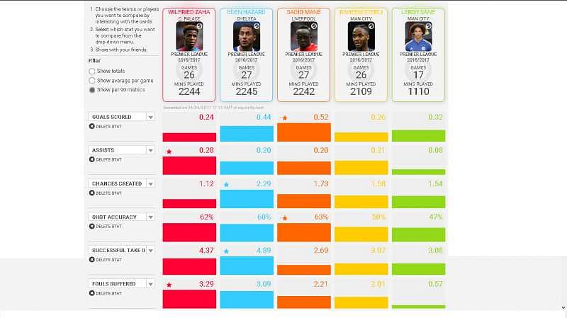 While the chances he creates per game needs to be worked on, his successful take-ons per game is almost on par with Hazard. Also, the remaining players play for top teams in the league, which means they are surrounded by top quality talent who can help them improve statistically. Zaha, on the other hand, playing for a team battling relegation, can be considered to be performing pretty well.
