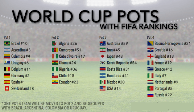 A few things that are key here are the placement of the Pots – Pot 1 has the seeded teams, basically the top seven teams and the host nation Brazil in the FIFA world rankings. Pot 2 has the qualifiers from Africa and the two unseeded teams from South America – Chile and Ecuador. Pot 3 has the Asian qualifiers along with the ones from Central and North America. Pot 4 has the remaining unseeded European teams.