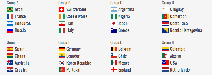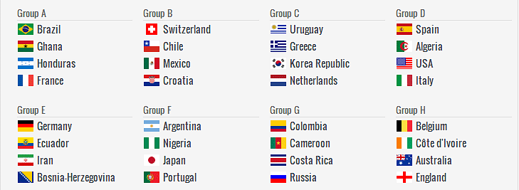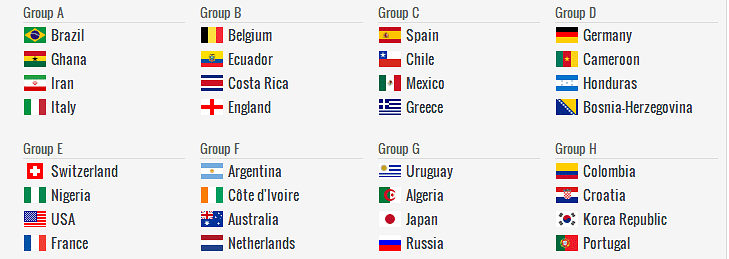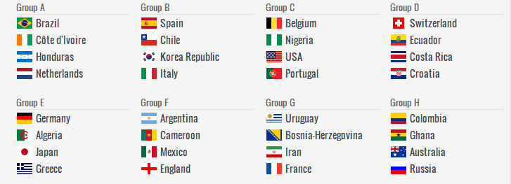Brazil and France again drawn in Group A while Spain and Italy in Group D also end up together again. Belgium, Cote d’Ivoire will trouble England in Group H.