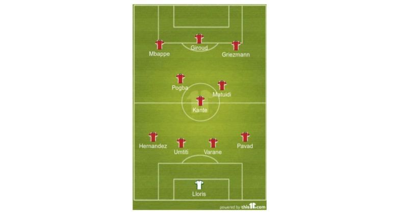 France: Lloris; Pavad, Varane, Umtiti, Hernandez; Kante, Pgba, Matuidi; Mbappe, Griezmann, Giroud.