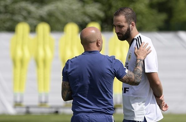 Jorge Sampaoli - the Argentina gaffer gives instructions to Gonzalo Higuain in training