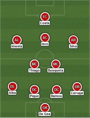 Isco, like every other Spanish player, will be in a freely moving role and is the primary focus of their attack. The lone striker is Diego Costa, who has had a great season with Atletico, but his exploits in the Spanish shirt haven't been great.
