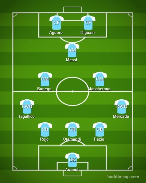 A four-man defence featuring Fazio and Otamendi in the centre and Mercado and Tagalfico wide is certainly solid. Moreover, unlike the aforementioned 3-4-1-2, this formation includes a defensive midfield pivot of Javier Mascherano and Lucas Biglia.