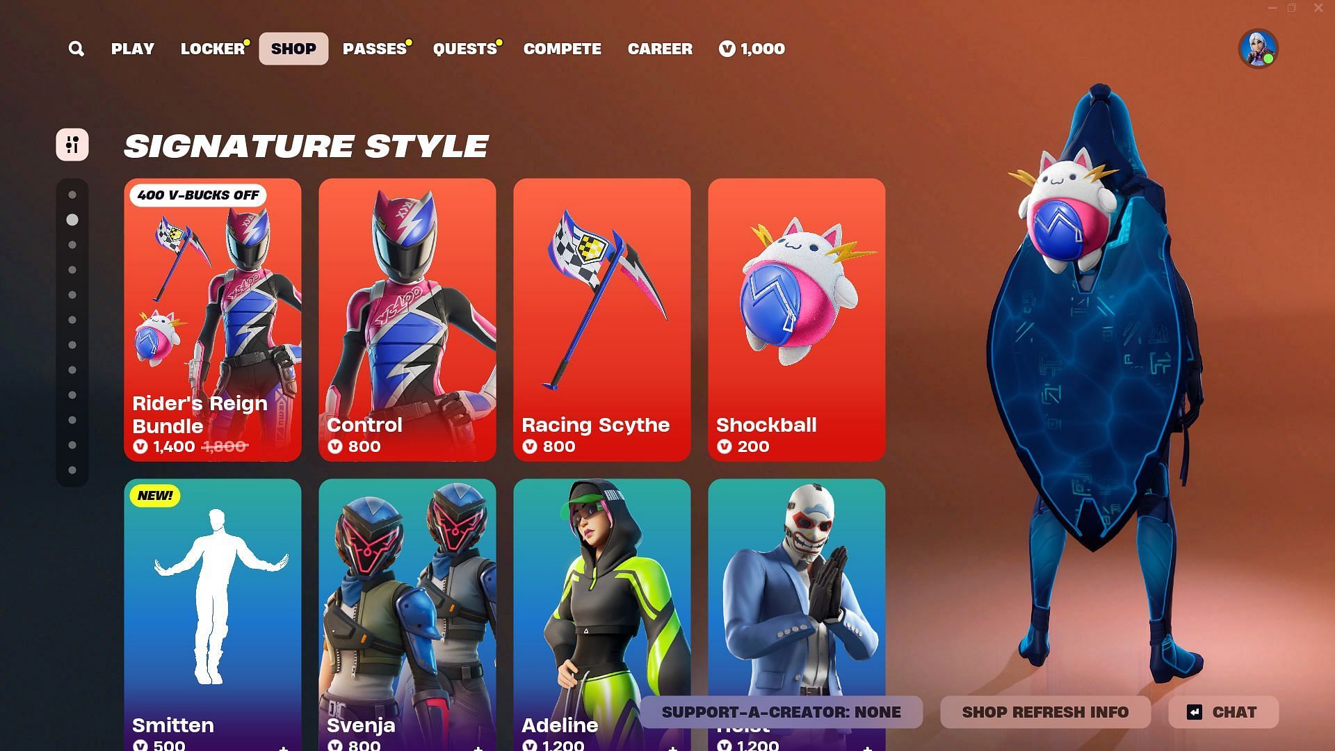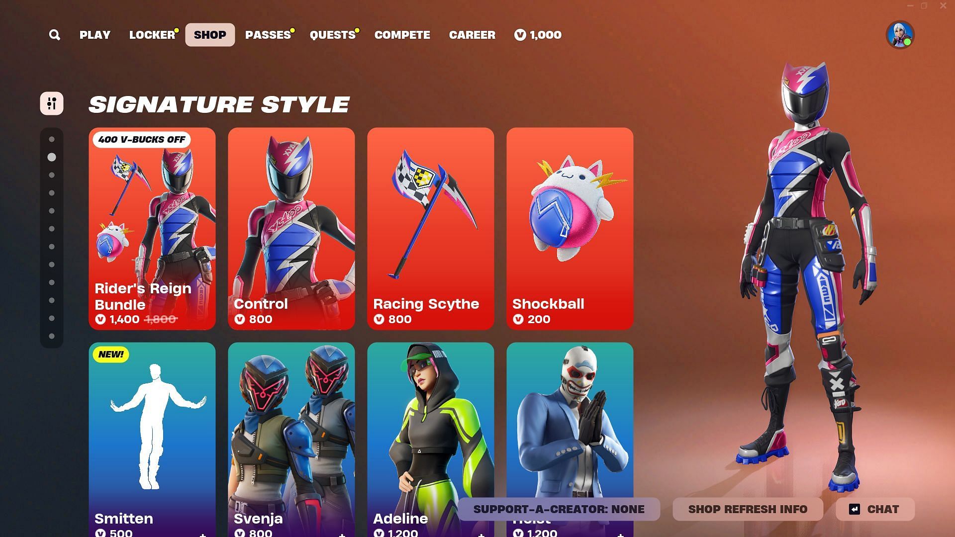 Control (Outfit) + Control (LEGO Outfit) can be purchased together for 800 V-Bucks. Racing Scythe (Pickaxe) and Shockball (Back Bling) can be purchased together for 800 and 200 V-Bucks, respectively.