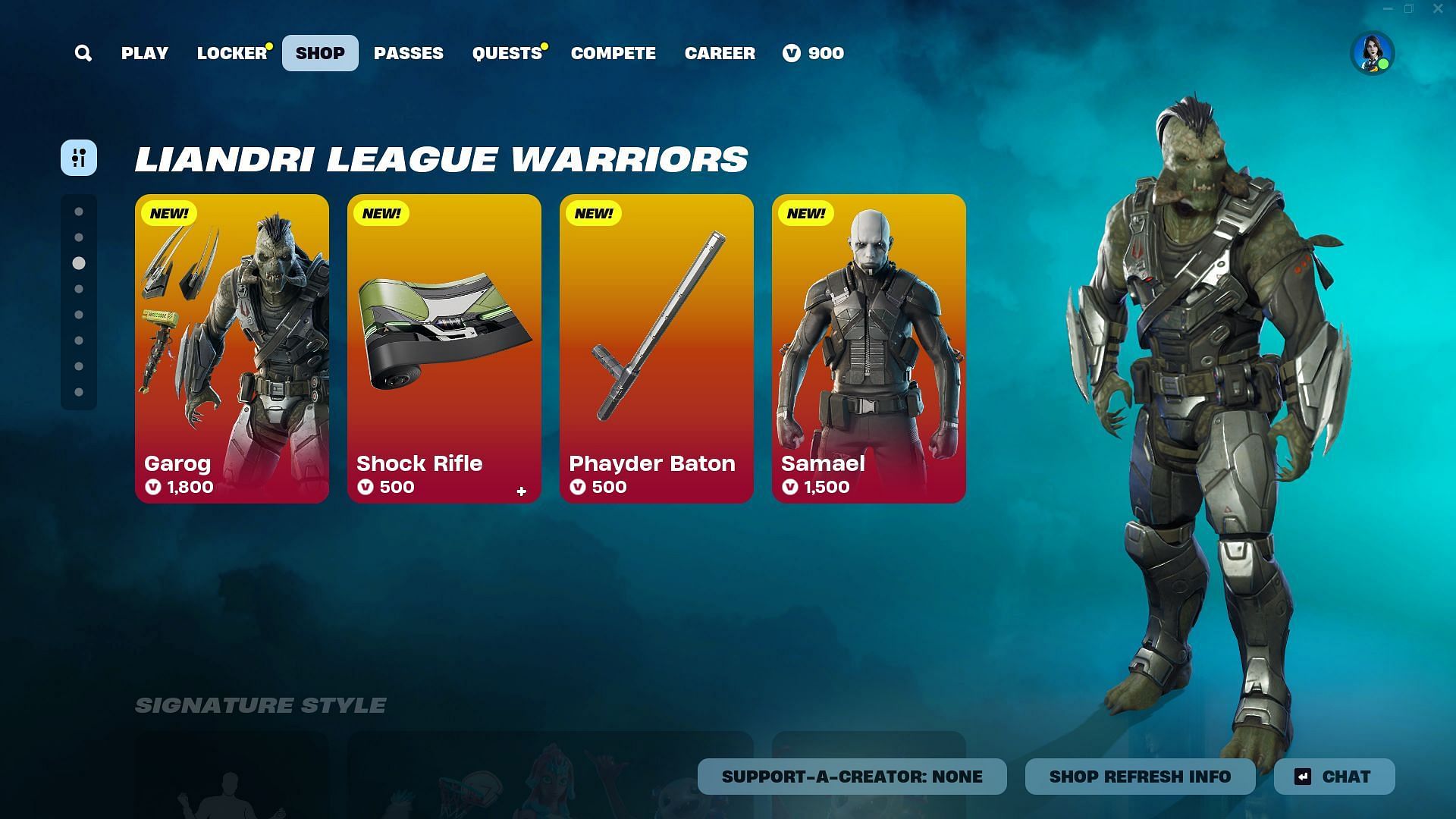 Garog (Outfit), Skaarj Razik (Pickaxe), and Mining Robot Head (Back Bling) can be purchased together for 1,800 V-Bucks. Samael (Outfit) and Nanoblack Sample (Back Bling) for 1,500 V-Bucks. Phayder Baton (Pickaxe) and Shock Rifle (Wrap + Animated) can be bought for 500 V-Bucks each.