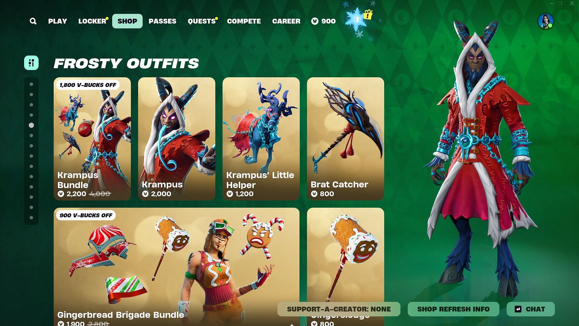 Krampus (Outfit) + Krampus (LEGO Style) and Brat Bag (Back Bling) can be purchased together for 2,000 V-Bucks. Krampus' Little Helper (Glider) and Brat Catcher (Pickaxe) can be purchased for 1,200 and 800 V-Bucks, respectively.