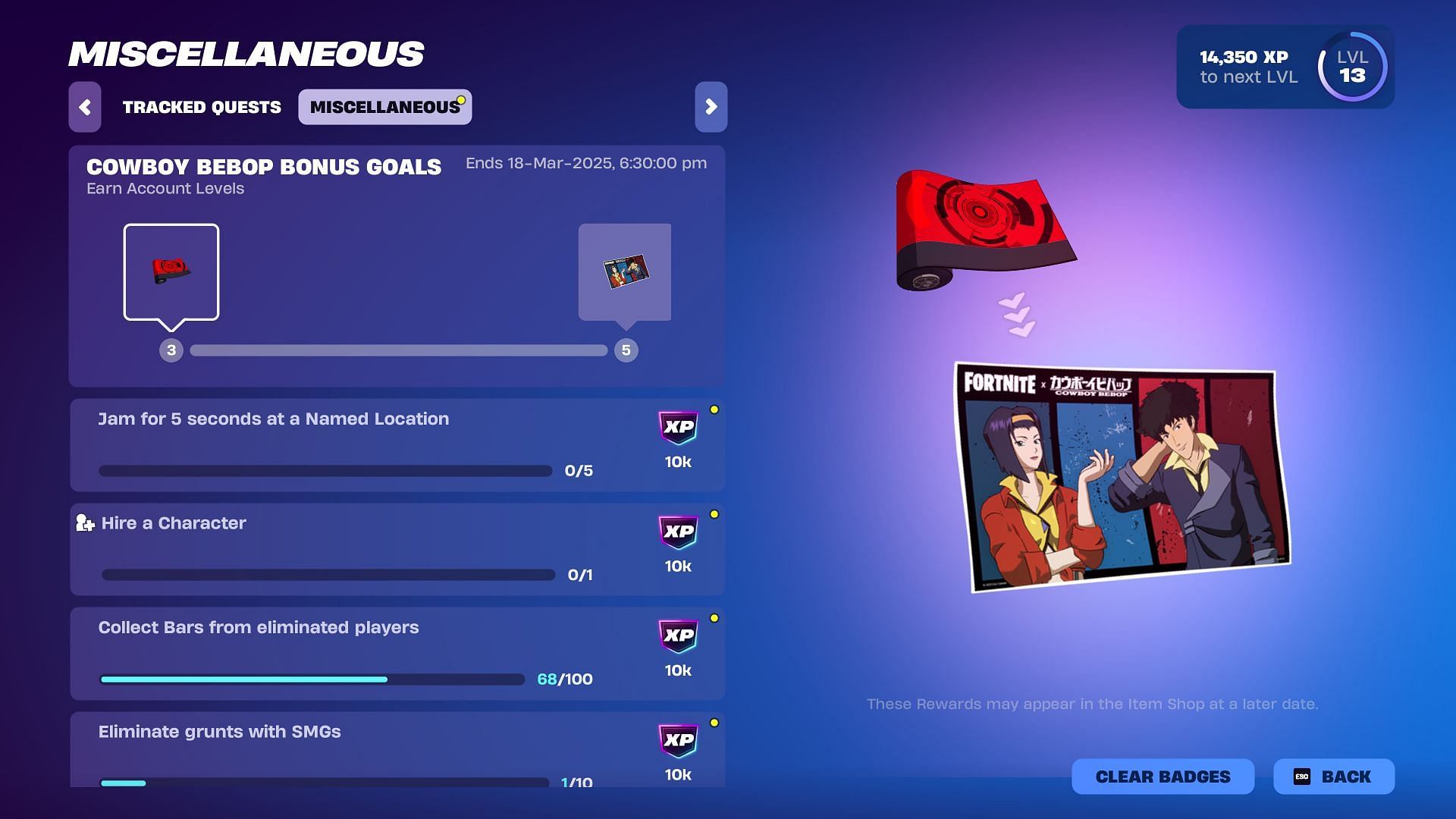 Note: Some players might not get the Cowboy Bebop quests in their quest tab due to an existing bug. Simply scroll through the list of available missions and look for it under the Miscellaneous tab, or start a new match.