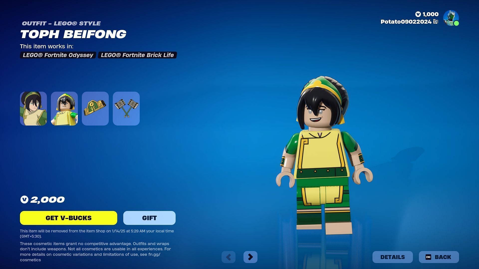 The Toph Beifong skin will remain listed in the Fortnite Item Shop till January 14, 2025, 8 PM Eastern Time. Moreover, Toph Beifong will return sometime in the future, as she is not exclusive. Check out the Fortnite Item Shop tomorrow to see what else Epic Games could list.