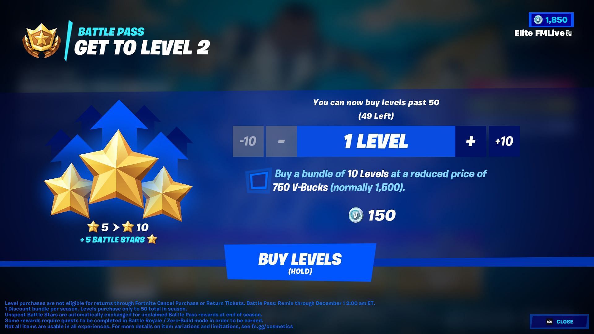 You can easily buy battle stars for the Fortnite Chapter 2 Remix Battle Pass from the Battle Pass page. Look for the yellow Buy Levels button on the right side of the screen. Choose the button and select the number of the levels you wish to purchase.