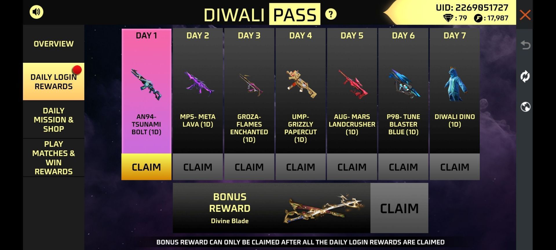 After unlocking the Diwali Pass, you need to log in for the next seven days to claim gun skin trial cards. The Divine Blade is available as a Bonus Reward after collecting the items for the required period.