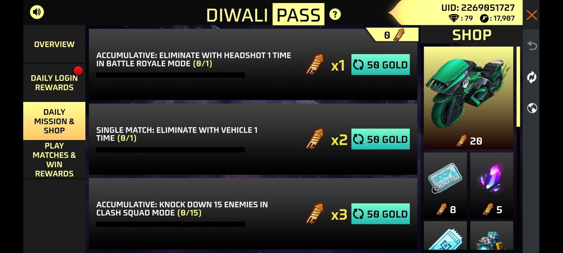 Diwali Pass Daily Mission and Shop (Image via Garena)