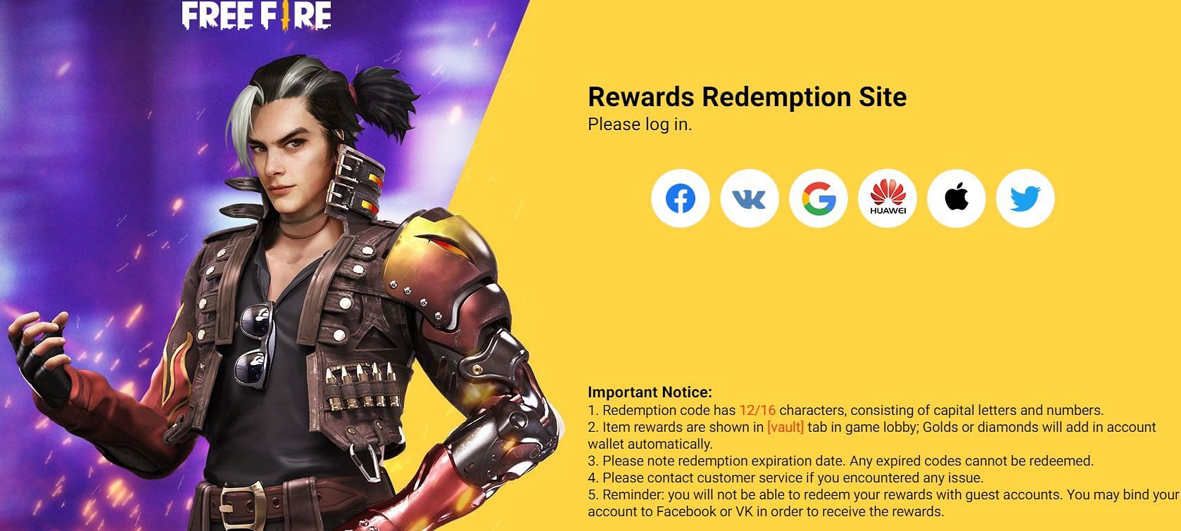 Step 2: Users will be required to log in to their account before claiming the code once they have accessed the given webpage. They are presented with the following options: Facebook, Google, VK, Twitter, Apple, and Huawei ID.