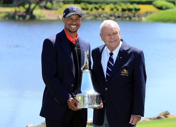 ORLANDO, FL – MARCH 25: Tiger Woods of the United States is presented with the trophy by Arnold Palmer of the United States. The win meant he re-gained the World’s number one position after the final round of the 2013 Arnold Palmer Invitational