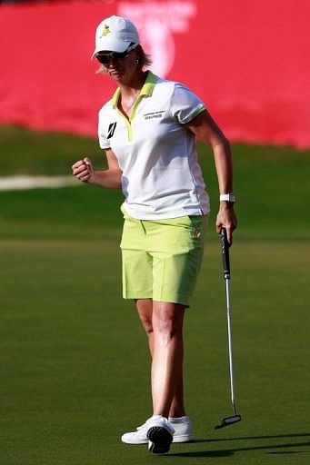 Karrie Webb of Australia reacts after she birdies the 18th hole during round two of the Mobile Bay LPGA Classic at the Crossings Course at the Robert Trent Jones Trail at Magnolia Grove in Mobile, Alabama, on May 17, 2013. Jessica Korda had seven birdies in her seven-under par 65 to seize a one-shot 2nd-round lead over surging Webb.