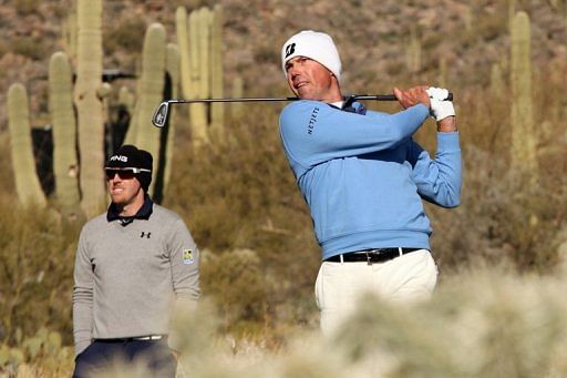 Matt Kuchar hits a tee shot on the 16th hole as Hunter Mahan looks on during the final round of the World Golf Championships – Accenture Match Play at the Golf Club at Dove Mountain on February 24, 2013 in Marana, Arizona. Kuchar denied Mahan a World Golf Championships Match Play title repeat, triumphing over his fellow American 2 and 1