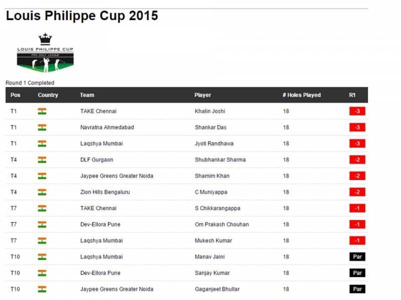 The TAKE Chennai team & Laqshya Mumbai Team share the lead at 4- Under par (Best of 2 scores) at the end of Day 1 of the Louis Philippe Cup. The TAKE Chennai team comprising of SSP Chawrasia, Khalin Joshi and Chikkarangappa put on a good show with a steady 3-Under par round from Khalin Joshi and 1-Under par round from Chikka to give the team the lead. Similarly the Laqshya Mumbai team with stars Jyoti Randhawa, Mukesh Kumar and Manav Jaini were helped with rounds of 3-Under par from Randhawa and 1-Under par from Mukesh Kumar.