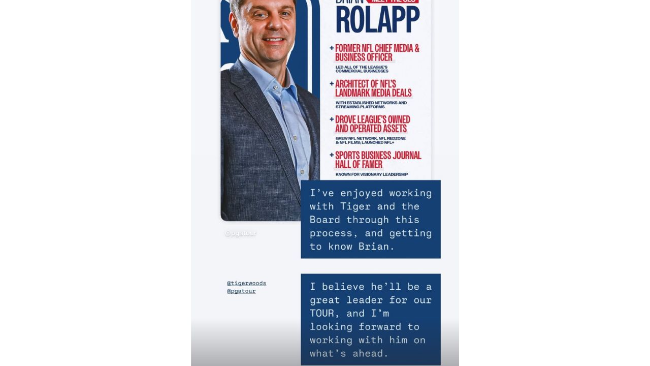 Tiger Woods said Brian Rolapp's appointment is "a win for players and fans." He also added that he's confident and excited for what the former NFL executive is going to bring to the table.