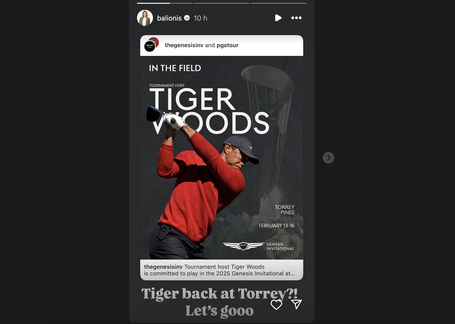 "Tiger back at Torrey?! Lets gooo," she wrote.