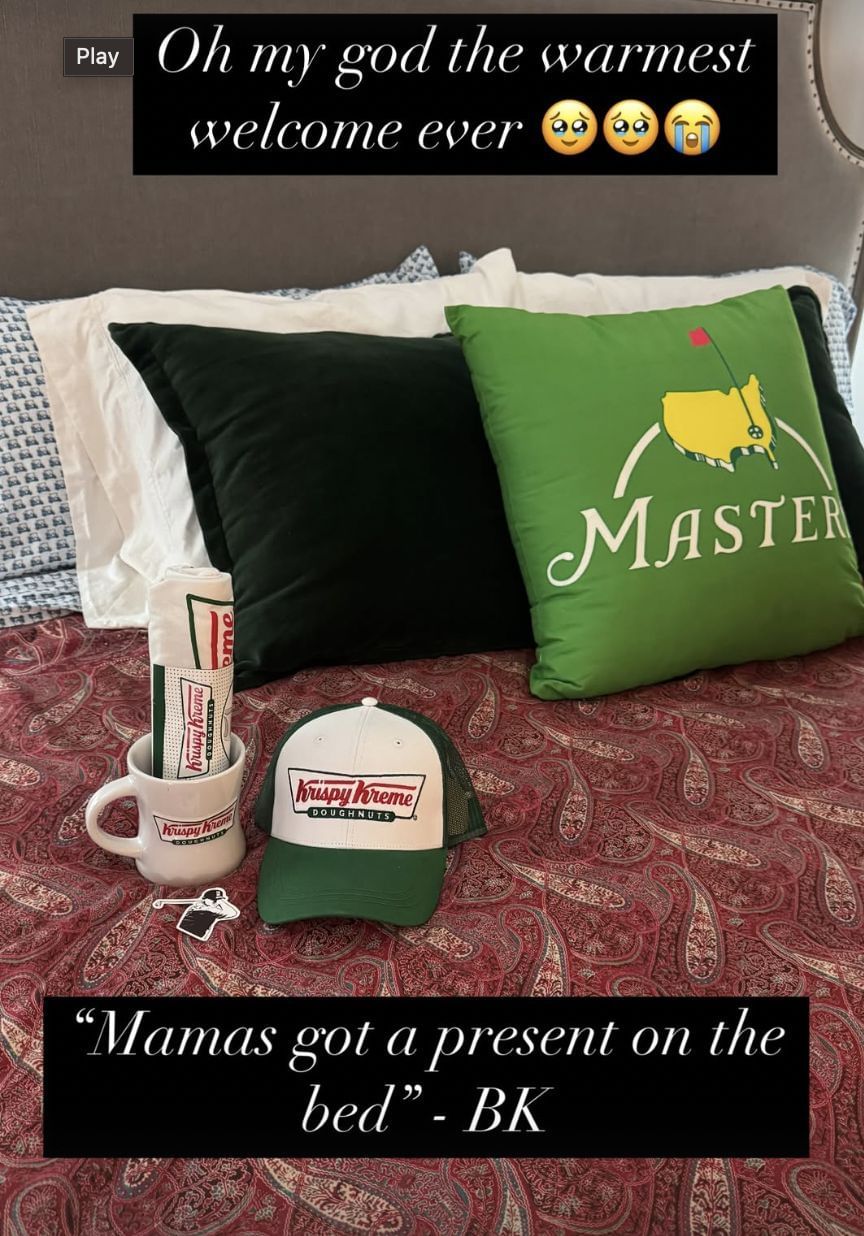 She also received gifts from Krispy Kreme, a white colored cup of the brand and a cap customized with the Masters theme. Beside the cup was a small black and white sticker of Brooks Koepka with his club.