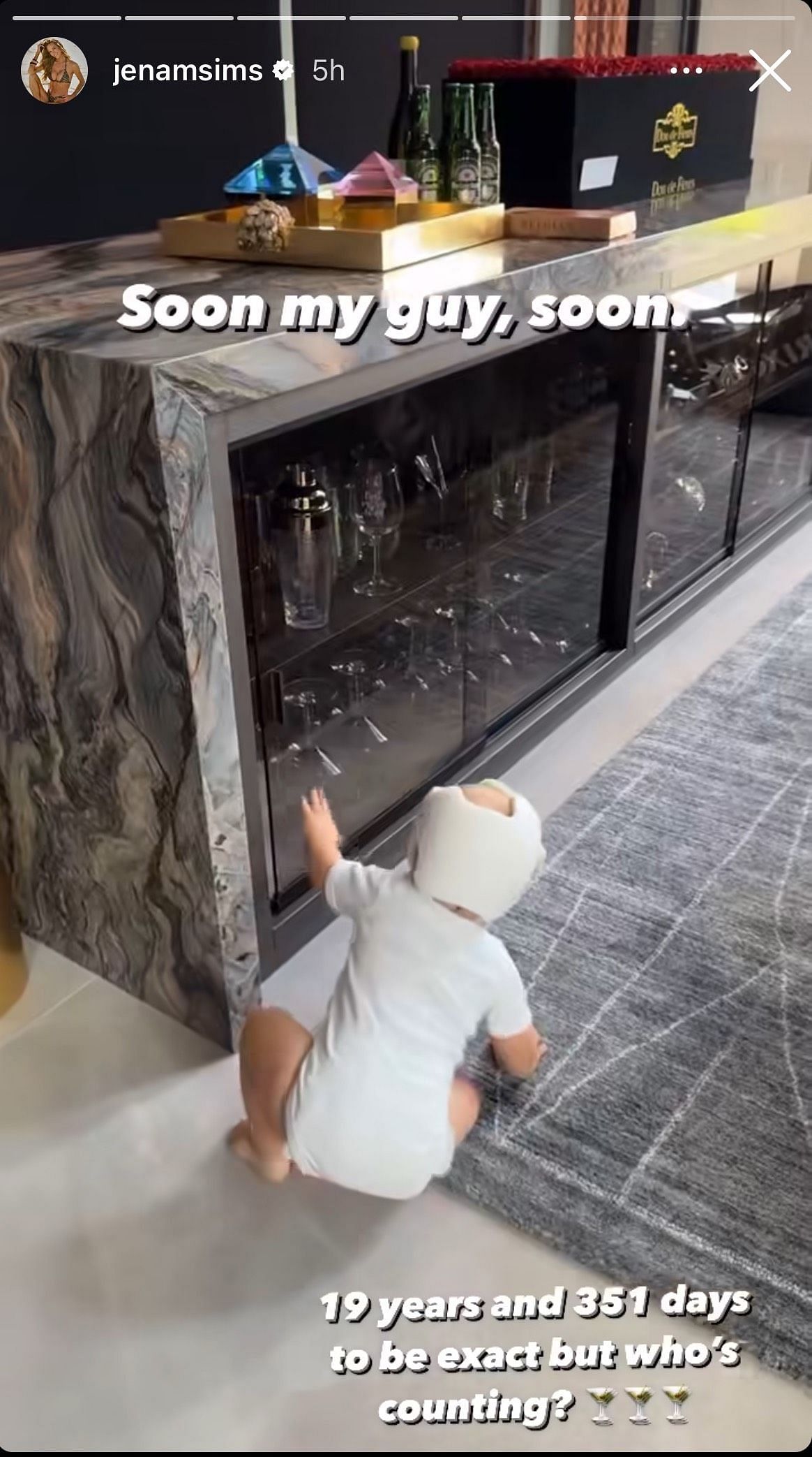 In the video, Koepka's and Sims' son is seen playing with their liquor cabinet, opening and shutting the door. Sims caption on the video is "soon my guy, soon" at the bottom of the video. She calculated when exactly he could have his first legal sip of alcohol: