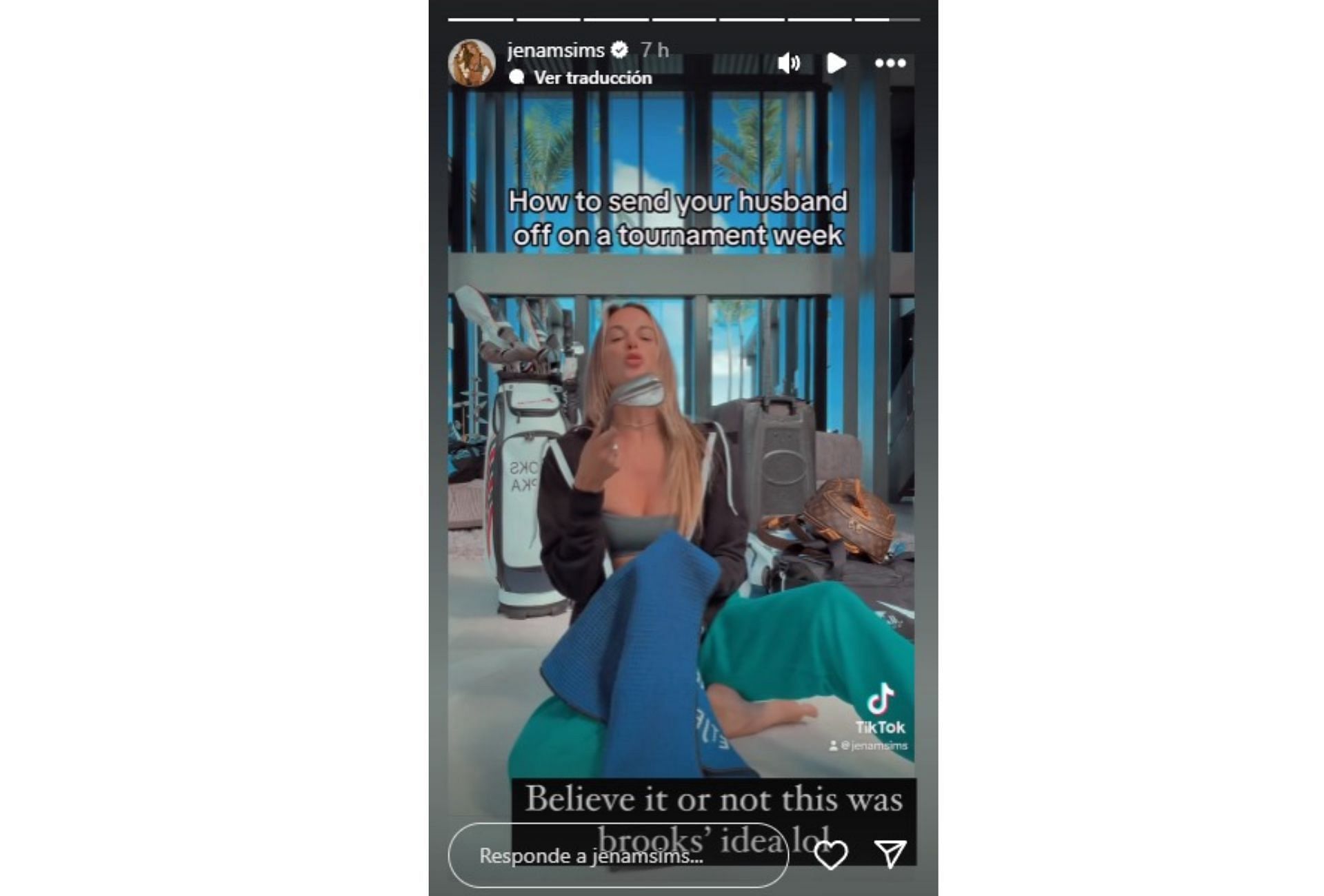 That's the case with her most recent post to her Instagram Stories. Jena Sims posted a video of herself cleaning Brooks Koepka's clubs, dubbing the audio from the "hawk tuah girl" video that recently went viral.