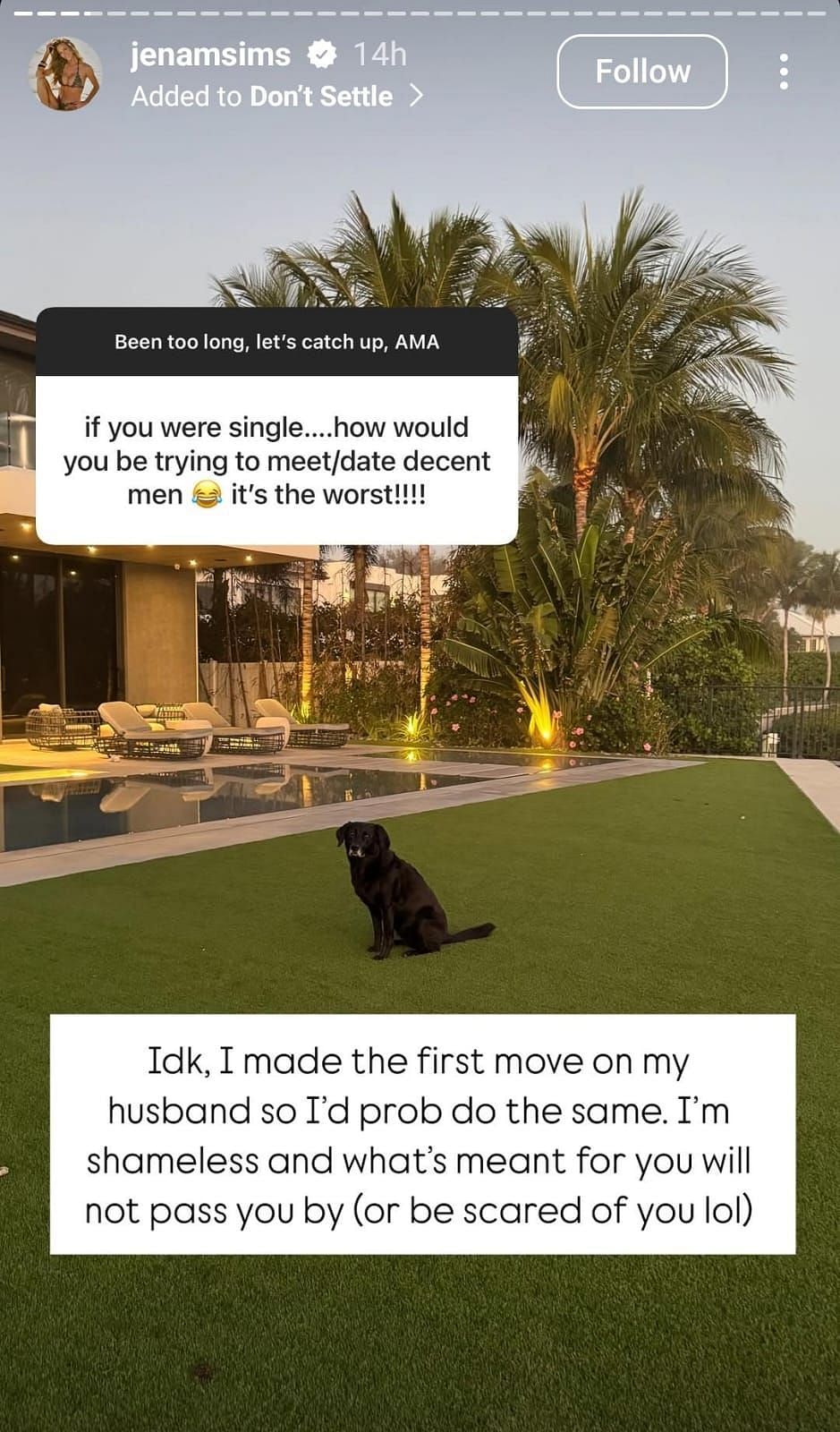 Brooks Koepka's wife, Jena Sims, made a big claim about her actions if she were single. Sims often participates in Q&A sessions on Instagram and shares her thoughts on questions asked by her followers. Recently, she did the same by participating in a session and uploading her answers as Instagram stories.