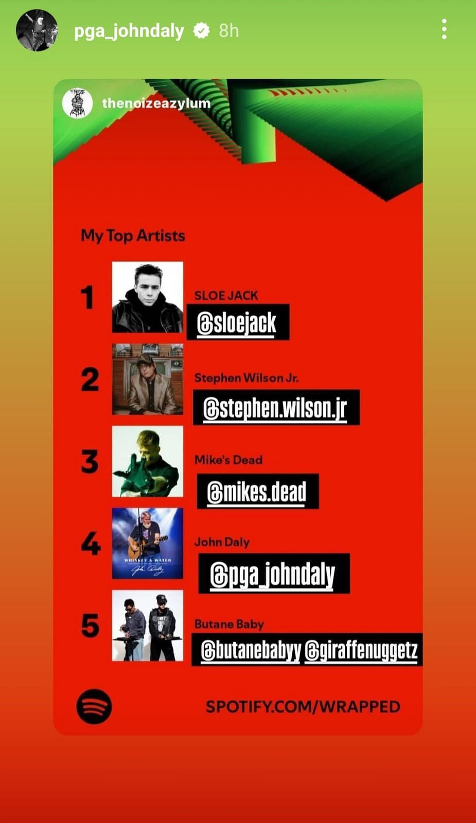 Recently, a fan's Spotify Wrapped list on Instagram featured John Daly's name. The American golfer enjoys singing, and his song "Whiskey and Water," released in 2022, was listed as number four in the fan's Spotify Wrapped "My Top Artists" list. John Daly reshared the story on his Instagram account.