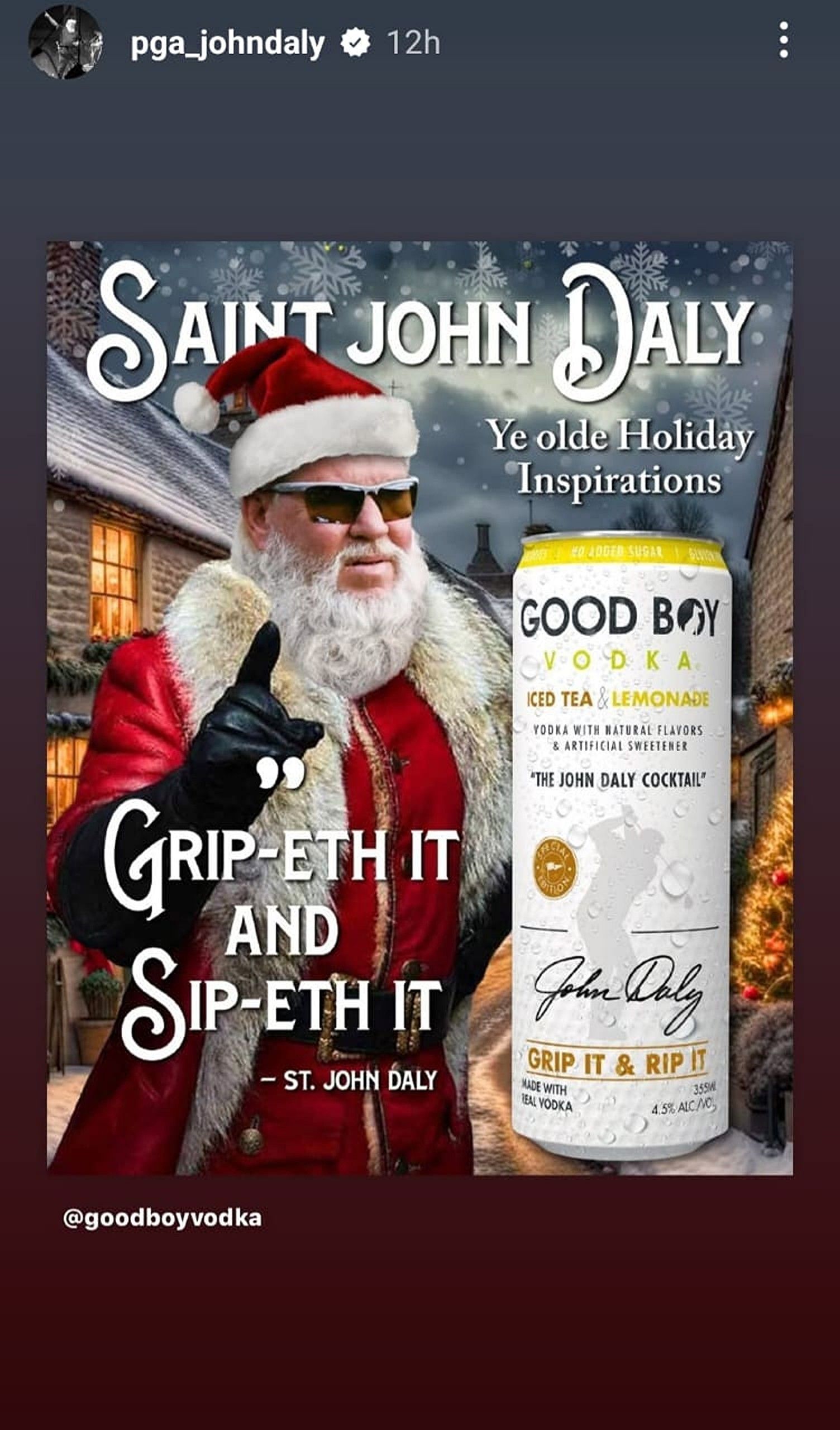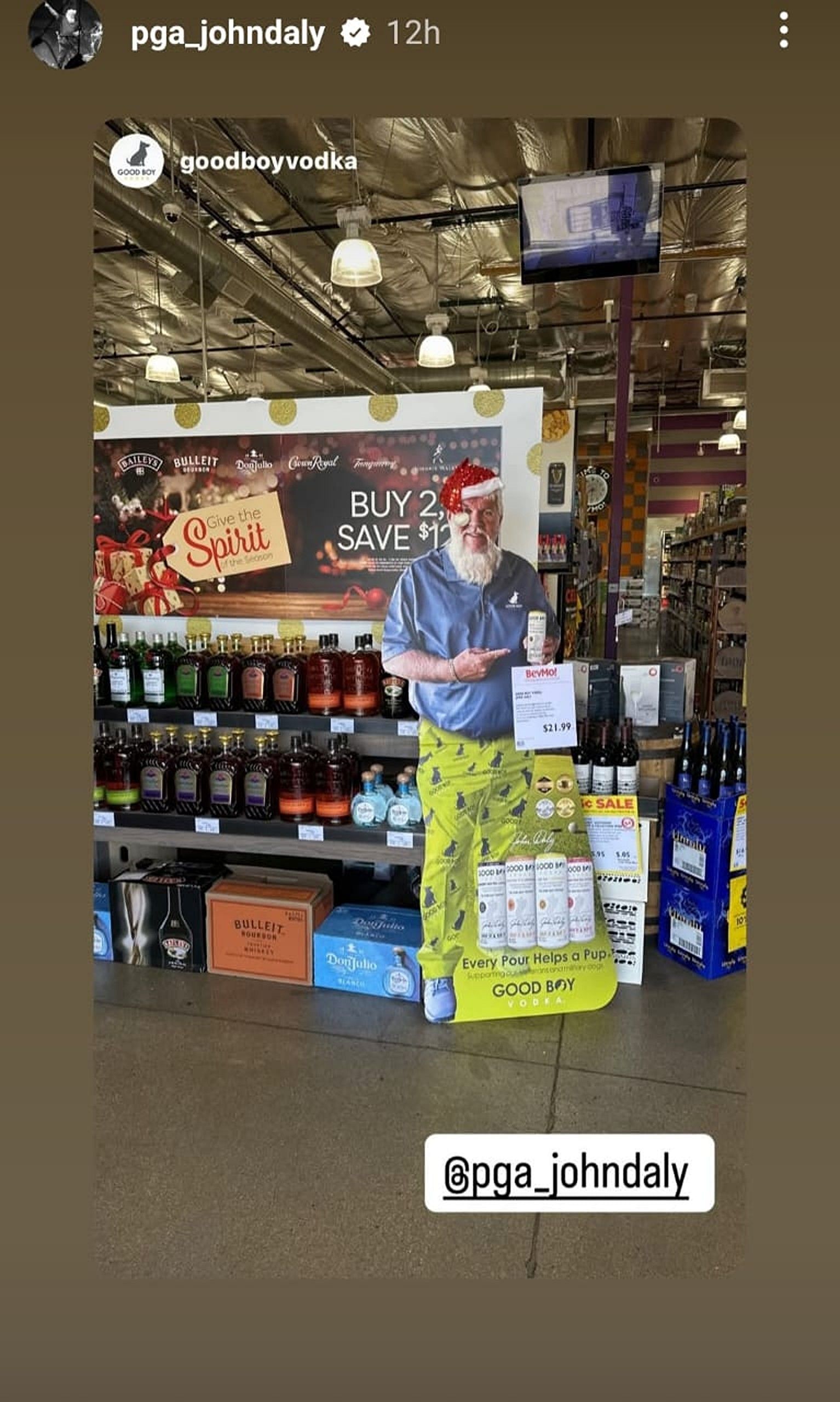 Daly shared another story on his account, showing a John Daly-in-Santa-hat-cardboard cutout promoting the Good Boy Vodka collection.