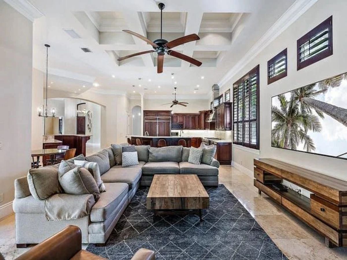 It is a 5500 square foot property with four bedrooms, and seven bathrooms (five of them full bathrooms and the other two half bathrooms). It also has a swimming pool, several living rooms, a kitchen, a bar, a three-car garage, and other amenities.