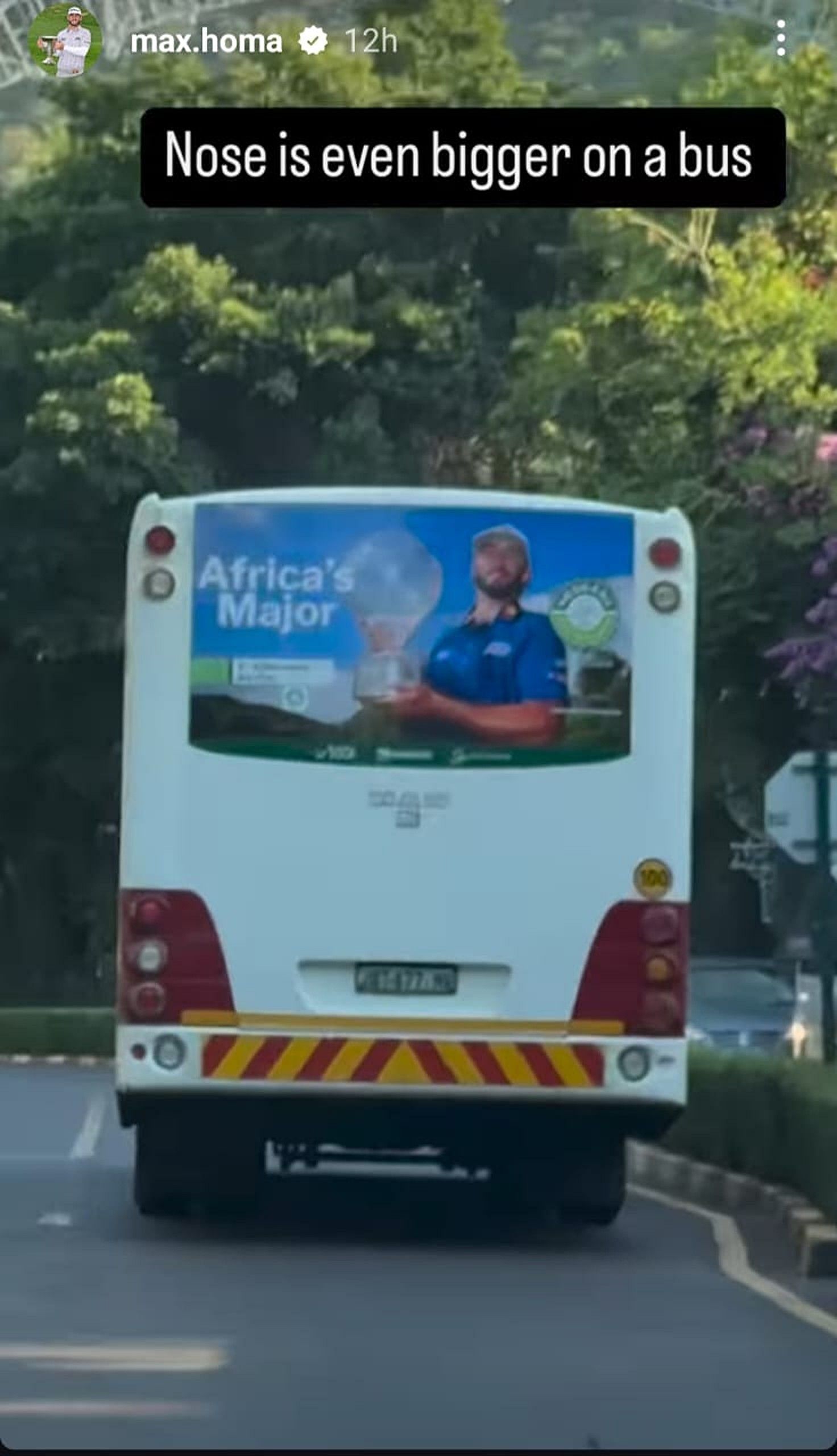 Recently, Max Homa shared a story on his Instagram account of a moving bus featuring his poster for the Nedbank Golf Challenge. The poster shows his picture holding a trophy with "Africa's Major" written on the side along with the Nedbank Golf Challenge logo. Sharing the video of the bus, Max Homa trolled himself by writing that his nose looks even bigger on a bus.