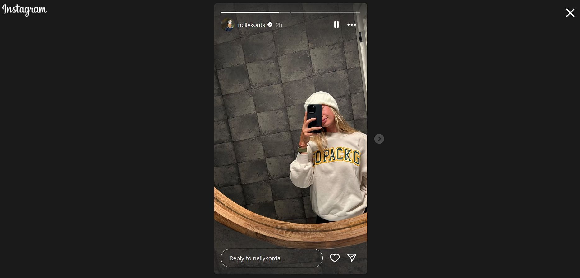 In the story section of her Instagram profile, Korda could be seen posing for a mirror selfie. Fans could spot her sporting an off-white pullover and a matching off-white winter headwear in the picture. The pullover happens to be official merchandise of the Green Bay Packers and has GO PACK GO written on the front in green font and outlined with chrome yellow, resonating with the team's iconic colors.