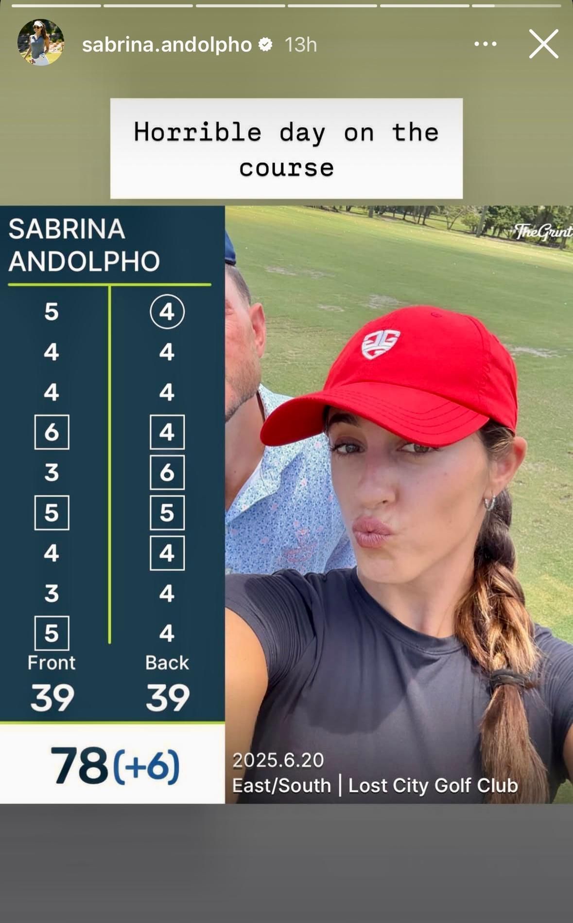 Sabrina Andolpho had a rough round at the Lost City Golf Club on June 20, 2025. She shared a photo on her Instagram story showing her scoreboard with a total score of 78, 6-over par. Her round featured 39 on the front nine and 39 on the back.