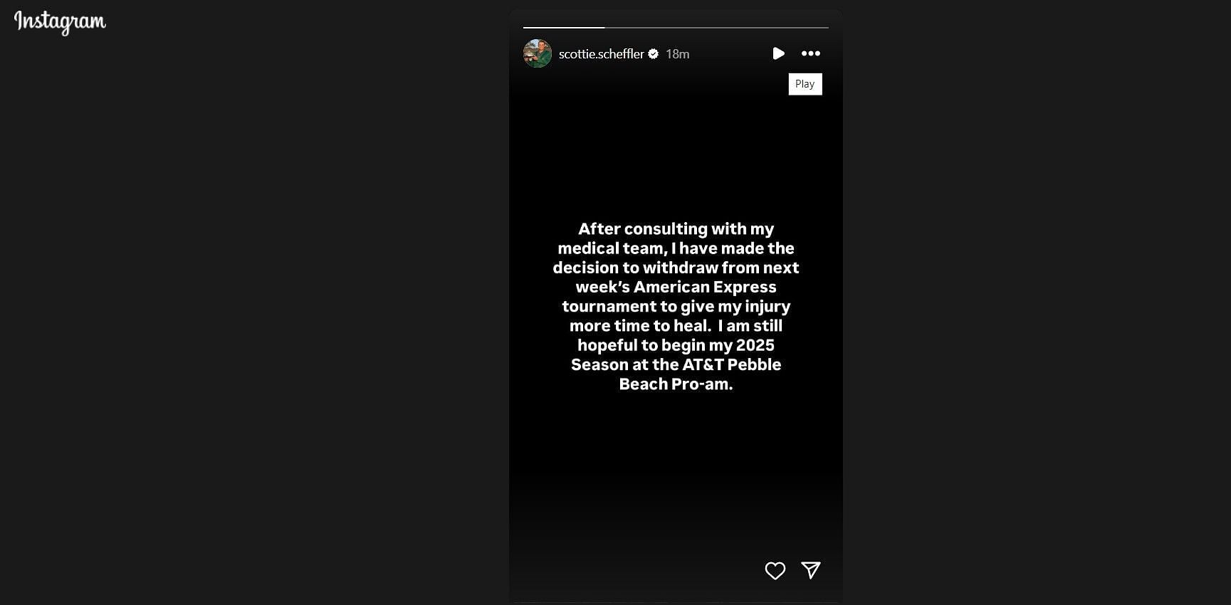 His official statement read: "After consulting with my medical team, I have made the decision to withdraw from next week's American Express tournament to give my injury more time to heal. I am still hopeful to begin my 2025 season at the AT & T Pebble Beach Pro-Am."