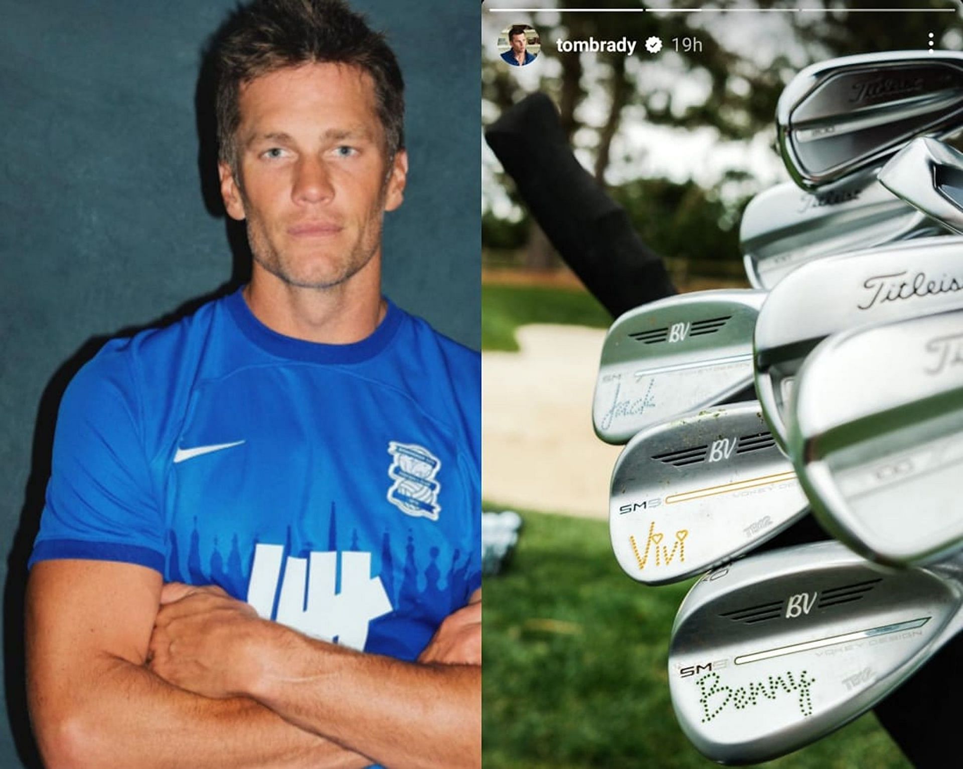On his Instagram story, Tom Brady posted pictures of his golf gear. He has been using Titleist Vokey SM9 wedges, which are engraved with the names of his children, Benjamin "Benny" Brady and Vivian "Vivi" Brady.