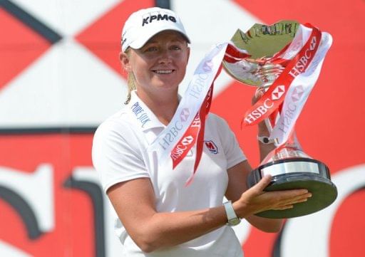 Stacy Lewis of the US poses with the trophy after winning the HSBC Women’s Champions LPGA golf tournament in Singapore on March 3, 2013.