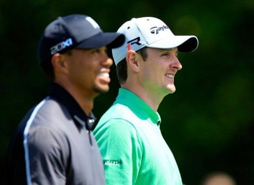 Tiger Woods (L) and Justin Rose walk down the 9th hole during the first round of the Arnold Palmer Invitational presented by MasterCard at the Bay Hill Club and Lodge on March 21, 2013, in Orlando, Florida. Woods, chasing Rory McIlroy for golf’s world No. 1 ranking, scrambled to a 69 on Thursday that left him four shots off the first-round lead of Justin Rose at Bay Hill.