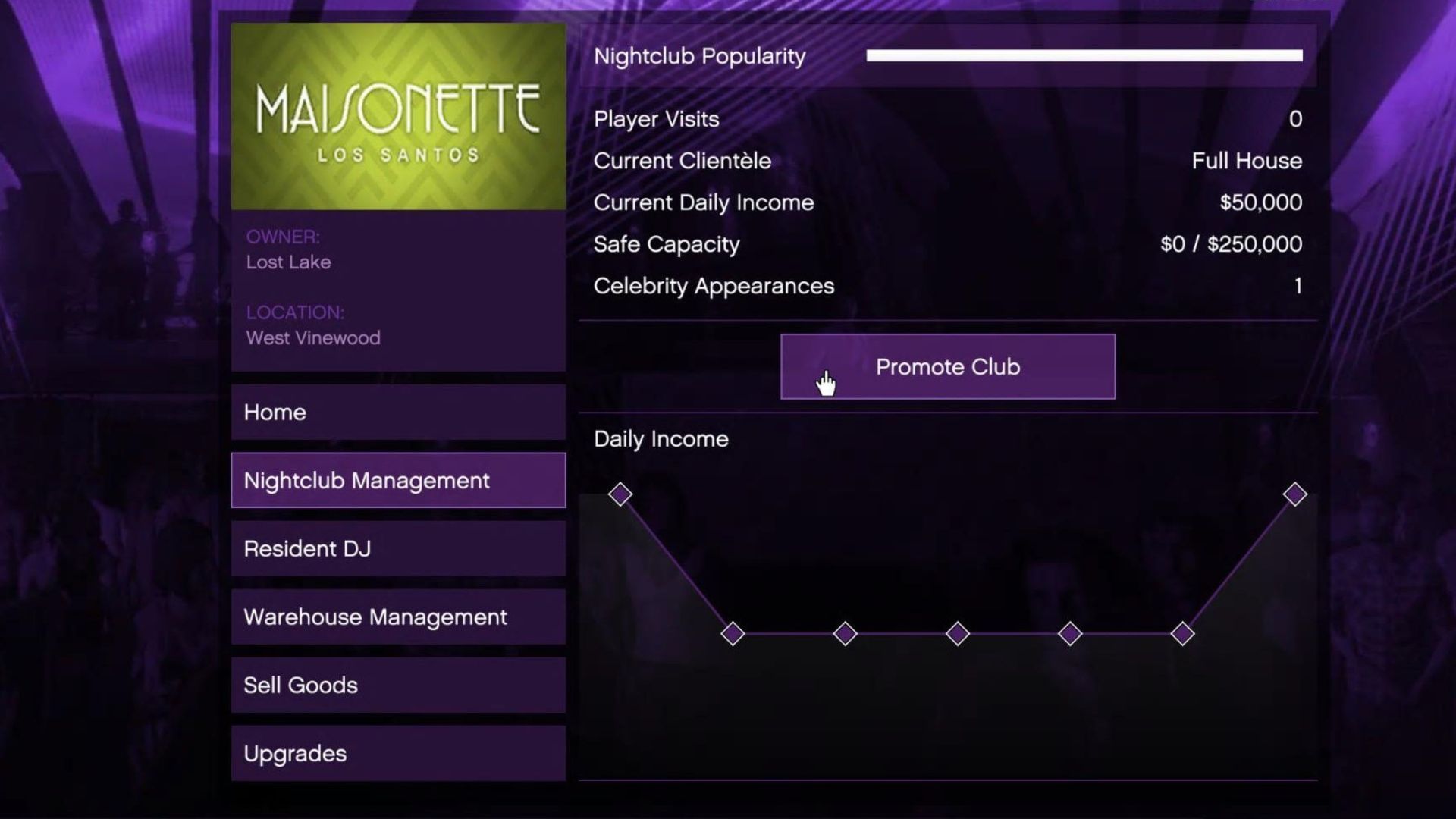 To maintain a high popularity level, complete Management missions at regular intervals. They can be started from the laptop in your Nightclub's office, or will be assigned as random events upon entering the property.