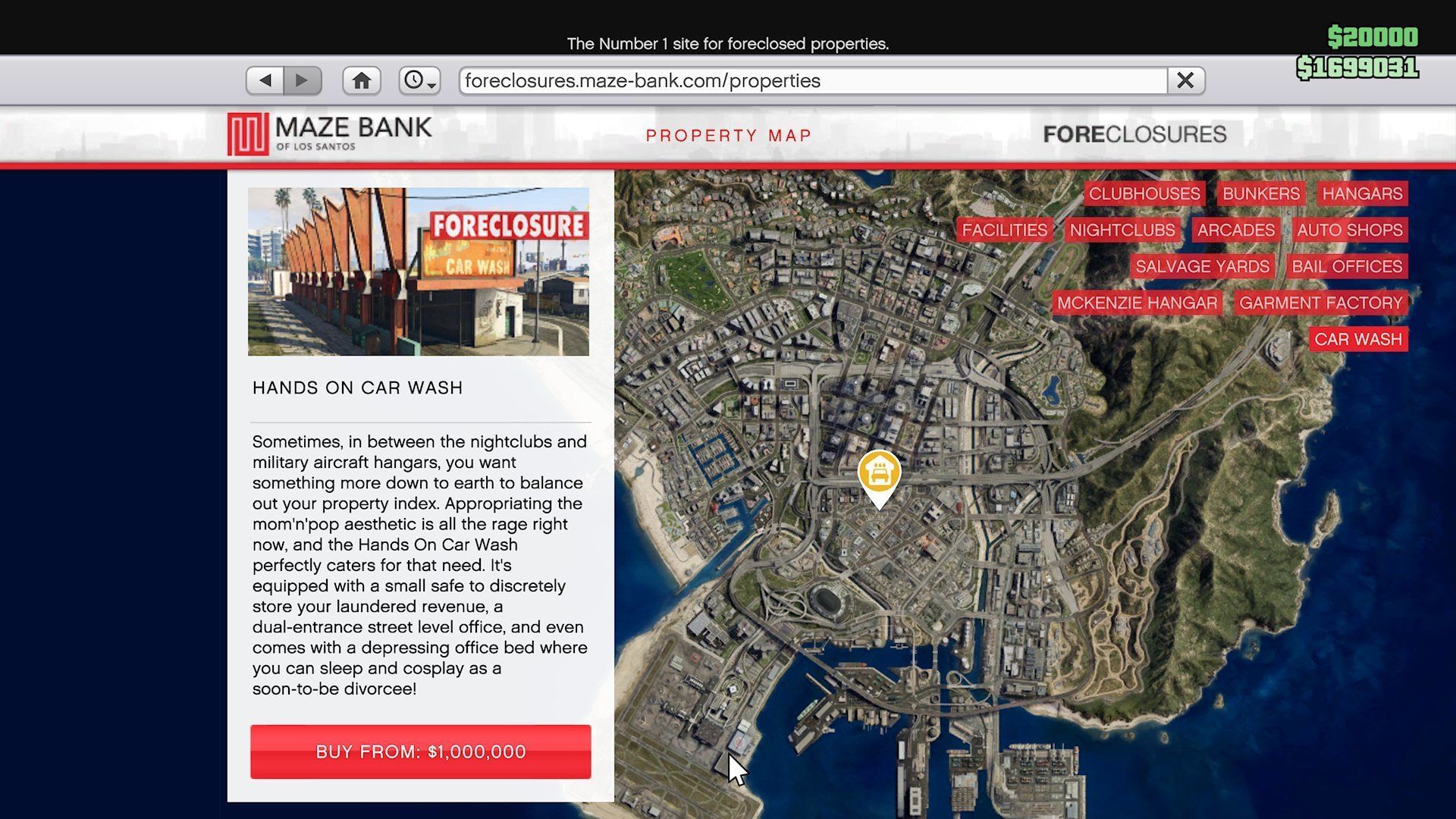The first business you can purchase after downloading the Money Fronts update in GTA Online is the Hands On Car Wash. This establishment can be acquired through the Maze Bank Foreclosures website within the game and is located in the Strawberry area.