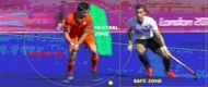 Indian forward is smartly tackling from the left. He is out of the danger zone and is floating in the safe zone.