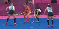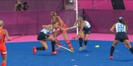 Argentina’s Right half, Mariela Scarone, is caught in the no man’s land, while tackling the Dutch left winger, Ellen Hogg, who is in the process of crossing the ball, while taking a back swing.