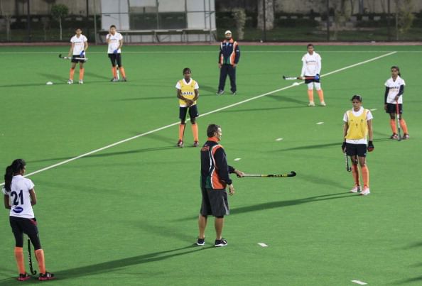 Indian Women’s hockey team players with coach Neil Hawgood during practice session at Dhyan Chand Stadium for the upcoming Hockey World League Round 2 on February 14, 2013 in New Delhi, India. (Photo by Vipin Kumar/Hindustan Times via Getty Images)