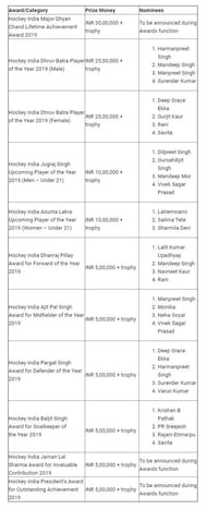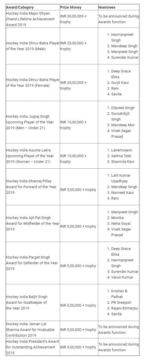 Hockey India President's Award for Outstanding Achievement 2019 as well as Hockey India Jaman Lal Sharma Award for Invaluable Contribution will also each carry a cash prize of INR 5.00 Lakhs and a trophy.