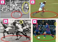 The collage above depicts Balbir, running gracefully with the ball in images 1 and 2. Harbinder (3), Balbir and Messi are running with the ball in almost the same style. They are not afraid to expose it by keeping it in front of them. Sometimes, they deliberately make it a common ball, to entice a defender to commit and take a bait.