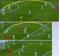 Photo #1 shows Messi being challenged by three Juventus opponents while executing semi-penetrating moves. Further, after reading the game situation, he calmly makes one aerial lob pass to eliminate eight opponents. This has resulted in creating a one on one goal scoring opportunity for Iniesta against the goalkeeper.