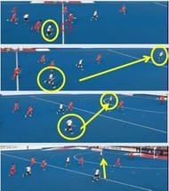 • The best move was to pass the ball to the R.W. first time or the 2nd player on the right could have slowed down & drop back, to form a triangle