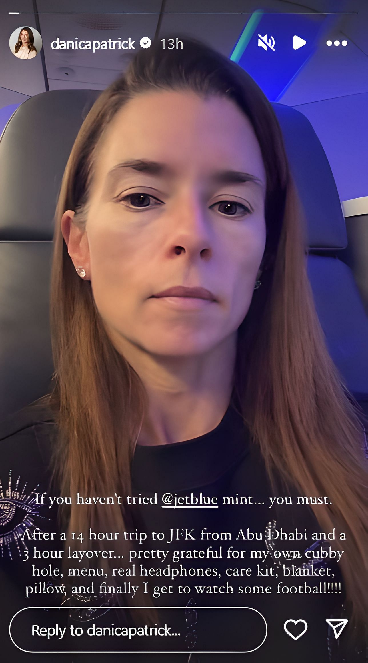 Danica Patrick recently flew back to the United States after fulfilling her duties as an F1 presenter at the Yas Marina Circuit, Abu Dhabi. But before disembarking from the aircraft, JetBlue, the former IndyCar driver made several videos about what she liked and clicked a selfie while donning a luxury black beaded sweatshirt.