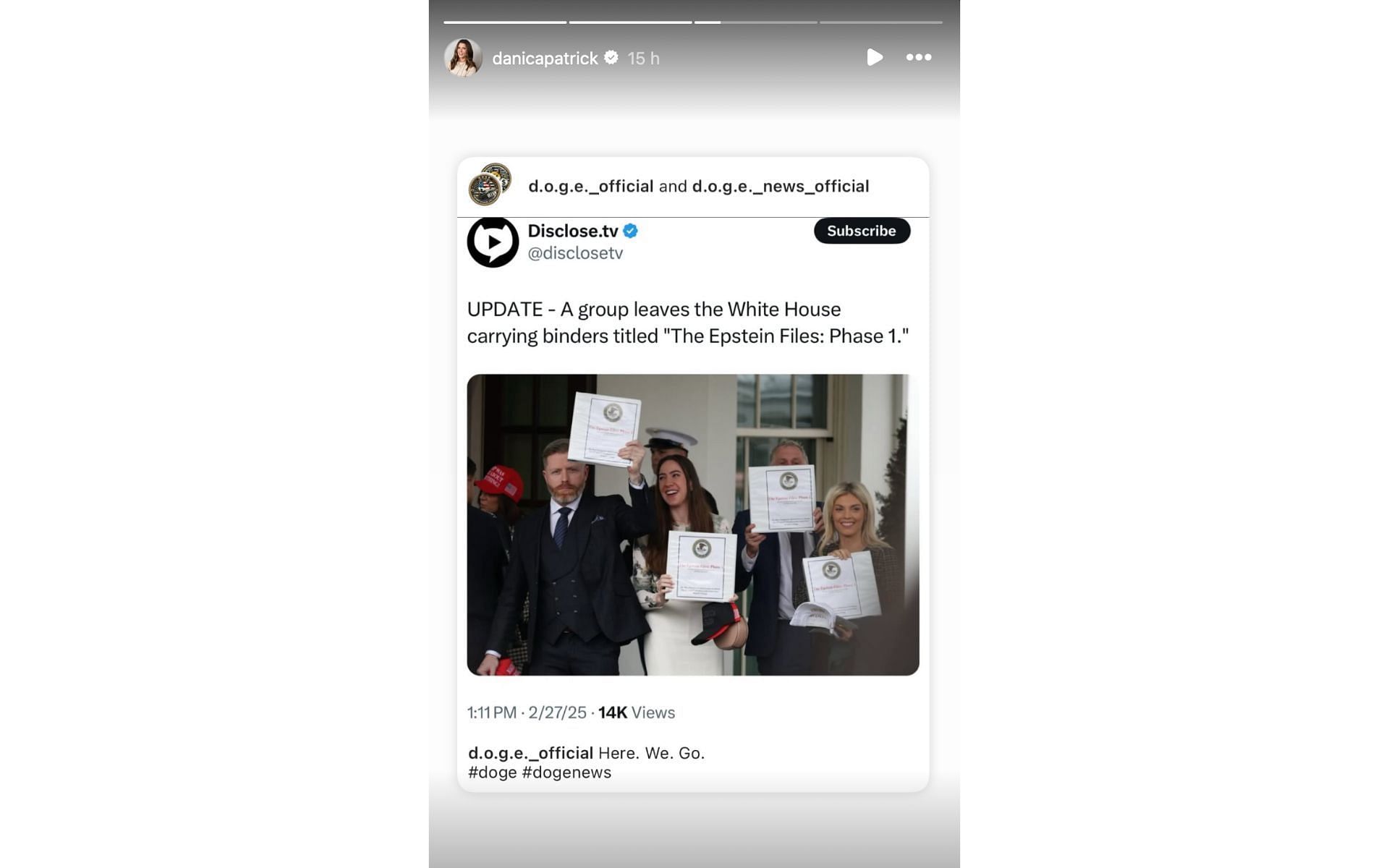 Subsequently, Danica Patrick shared how the names were revealed in Phase 1 of the "Epstein files" and posted a story on her Instagram on February 27: